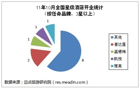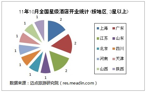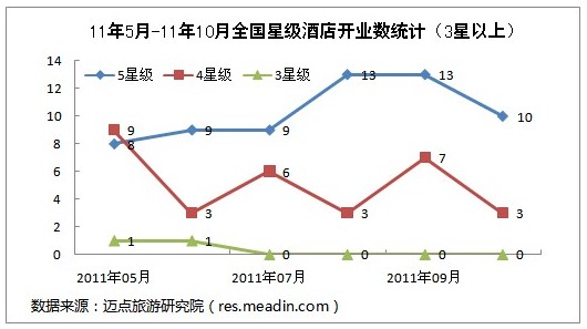 据迈点旅游研究院对国内酒店开业情况的不完全统计,2011年10月,国内开业的星级酒店数为13家,客房总数约4148间(套)。与上月相比,本月新开业星级酒店总数减少了7家,降幅为35%;而客房总数与上月相比减少约1416间(套),降幅达25%。