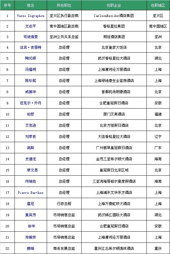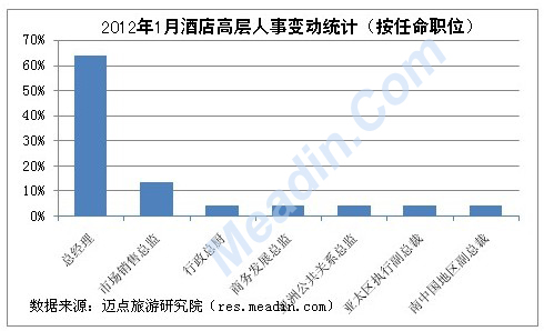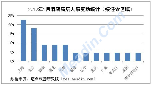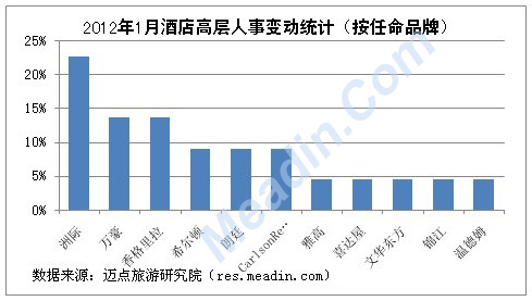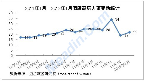 2012年1月,进入迈点网“中国酒店业行业监测系统平台”的5982家星级酒店企业中,共有20家酒店(集团)任命了22位高管,比11年12月份增加了3位。