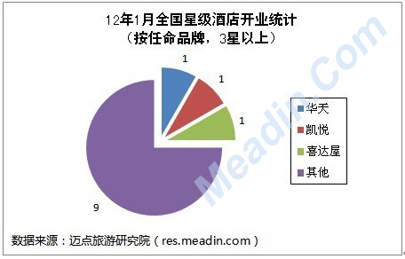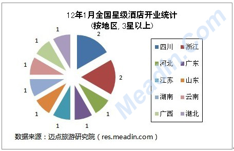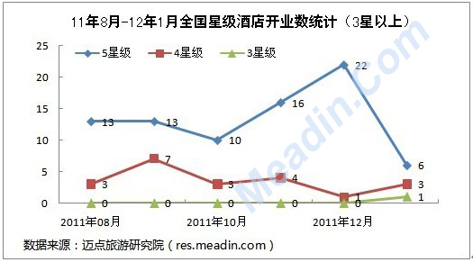 据迈点旅游研究院对国内酒店开业情况的不完全统计,2012年1月,国内开业的星级酒店数为12家,客房总数约3073间(套)。与上月相比,本月新开业星级酒店总数减少了11家,降幅为48%;而客房总数与上月相比减少约3859间(套),降幅高达56%,本月正逢新春佳节,所以只有较少的高星级酒店开业。