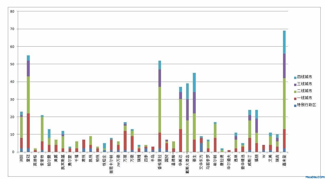 笔者对洲际(洲际、皇冠、英迪格)、雅高(索菲特、铂尔曼、美爵)、费尔蒙、凯宾斯基、千禧、凯悦(君悦、凯悦、柏悦)、悦榕庄、万豪(丽思卡尔顿、JW万豪、万丽、万豪)、四季、半岛、香格里拉(香格里拉、国贸)、温德姆(温德姆至尊豪廷、华美达、戴斯大酒店、豪生)、文华东方、马哥孛罗、希尔顿(希尔顿、康拉德、华尔道夫、逸林)、喜达屋(豪华精选、威斯汀、福朋、W、艾美、瑞吉、喜来登)等16家国际著名酒店管理集团旗下的39个高端(UPPER CLASS)和奢侈(LUXURY)的连锁酒店子品牌进行了逐一的研究,采用登录官方网站的方式对其在华区域所有可预订酒店及在建酒店的信息进行统计、分类,并经过数据分析形成以下一些观点: