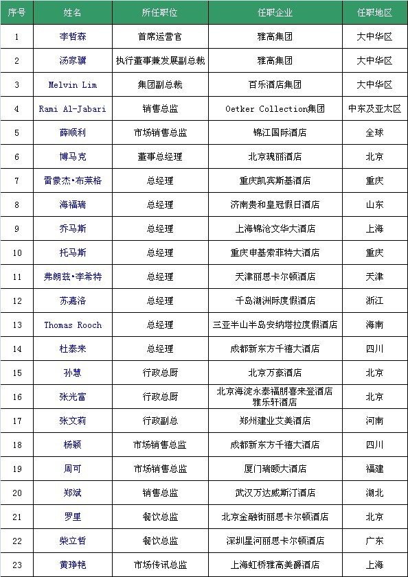 从人事任命的职位来看,本月任命最多的是总经理职位,任命了8位,占全部星级酒店人事任命的35%。紧随其后的是市场销售总监职位,本月共任命了6位,占全部星级酒店人事任命的26%。其次行政总厨和餐饮总监职位均有2位任命,各占任命总数的9%。除了以上提到的,本月还有其他一些职位的任命,包括市场传讯总监、董事总经理、集团副总裁等。