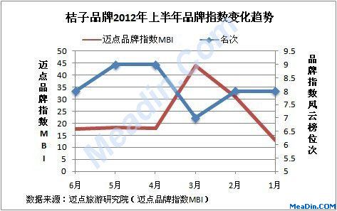 迈点品牌指数MBI显示,从排名位次上看,桔子酒店2012年上半年一直上下波动,但是波动幅度不大,一直围绕第8位这个店波动,总体来看变化幅度比较小。从品牌指数数据看,桔子酒店2012年上半年品牌指数在2月和3月出现了较大的波动,品牌指数飞升,但在4月份回落,除去2月3月波动的影响,整体来看,桔子酒店的品牌指数呈现上升态势,即表示桔子品牌的在华影响力上升。