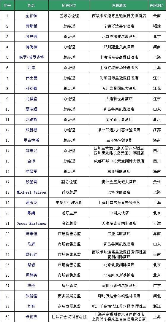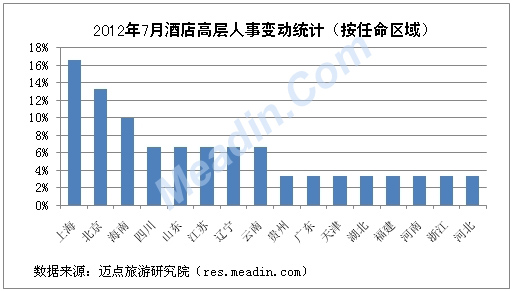 2012年7月,进入迈点网“中国酒店业行业监测系统平台”的5982家星级酒店企业中,共有30家酒店(集团)任命了30位高管,比上月增加了7位,增幅30%,与去年同期相比,增加了8位。