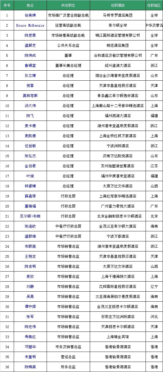 从人事任命的职位来看,本月总经理职位人事任命最多,但比上月有所减少,共任命了12位,占全部星级酒店人事任命的33%;市场销售总监职位,本月共任命了11位,占全部星级酒店人事任命的31%;其次本月行政总厨职位也出现了5个任命,占任命总数的14%,其中有2位是中餐行政总厨。除了以上提到的本月还有其他一些职位的任命,包括财务总监、营运总监、公关关系总监、董事等,其中还包括集团任命的一些高管职位。