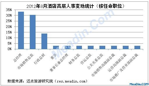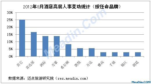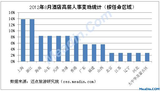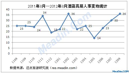 2012年8月,进入迈点网“中国酒店业行业监测系统平台”的5982家星级酒店企业中,共有31家酒店(集团)任命了36位高管,比上月增加了6位,增幅20%,与去年同期相比,增加了11位,增幅44%。