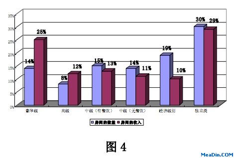 从图中可以看出,豪华型客房占总客房数量的比例是14%,但是所占的收入比例却是25%,而占总客房数量仅8%的高级酒店所贡献的收入也达到了行业收入的12%。这些数字说明了两个问题:第一,各种类型的酒店应该有一定的合理比例;第二,高档豪华的酒店数量在整个酒店业中的比例不应该太高,应当保持一个相对较少的数量,与经济和社会的发展相匹配。