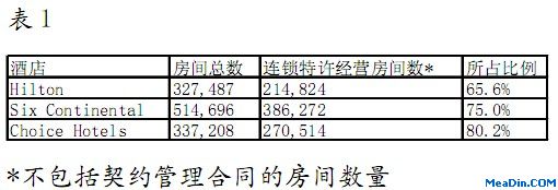 表1中的三个酒店集团分别定位于高档、中高档和中低档,它们无一例外的都拥有超过65%以上的连锁特许经营的酒店房间数量。而且随着档次的降低,连锁经营的房间数量所占比例越来越多。这也证明,连锁特许经营在中低端市场上占据着主导地位。