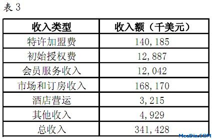 通过表3可以清楚地看到Choice Hotels的收入组成。Choice Hotels的收入全部来自于连锁特许经营收入,而其中特许加盟费占到了41%,市场和订房收入则是向加盟店收取的订房和市场营销的成本补偿。