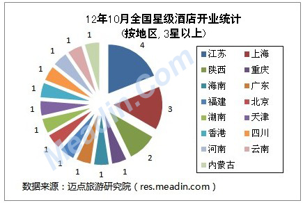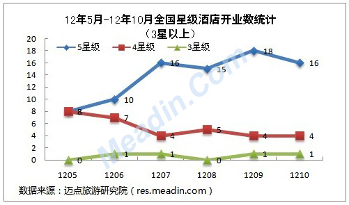 据迈点旅游研究院对国内酒店开业情况的不完全统计,2012年10月,国内开业的星级酒店数为21家,客房总数约6022间(套)。与上月相比,本月新开业星级酒店总数减少了2家,降幅为11%;客房总数与上月相比减少约8102间(套),降幅为56%。本月开业酒店中,五星级酒店有16家、四星级酒店有4家、三星级酒店有1家。