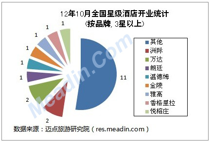 2012年10月,国内开业的星级酒店数为21家,从开业酒店的地域分布来看,本月开业的21家高星级酒店分布在15个不同的地区。从开业酒店的品牌分布来看,本月单体酒店和品牌酒店数几乎是各占总开业数的一半,相比上月,单体酒店的数量有所增加。