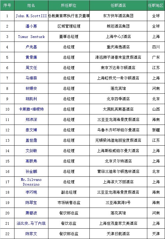2012年11月,进入迈点网“中国酒店业行业监测系统平台”的5982家星级酒店企业中,共有20家酒店(集团)任命了22位高管,比上月减少了8位,降幅27%,与去年同期相比,减少了2位。
