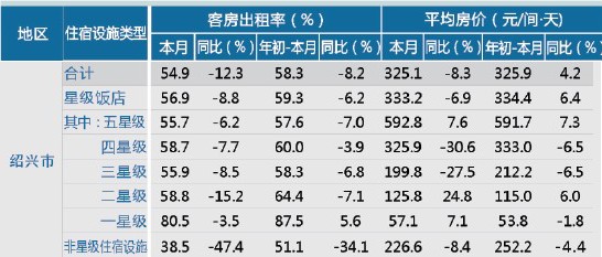 [绍兴]12年11月星级饭店平均房价和出租率 迈点网 · Ann · 2012-12-29 11:24:28 分享到 打开微信“扫一扫”,打开网页后点击屏幕右上角分享按钮。 根据浙江省统计局统计数据,12年11月,绍兴市星级饭店平均房价为325.1元/间,同比下降8.3%。12年11月,绍兴市星级饭店平均出租率为54.9%,同比下降12.3%。 绍兴星级饭店平均房价和出租率 0