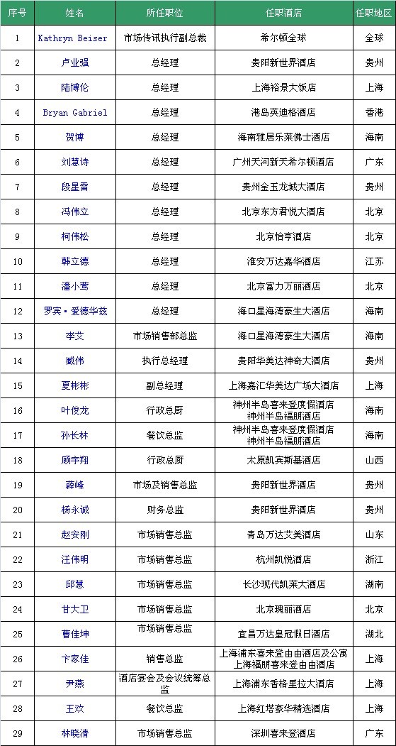 从人事任命的职位来看,本月总经理职位人事任命最多,共任命了12位,占全部星级酒店人事任命的41%,与上月相比,总经理任命的人数减少了2位。其次本月市场销售总监有9位任命,占全部星级酒店人事任命的31%。12月还出现了餐饮总监和行政总厨的任命,这两个职位各有2位高管任命,各占任命总数的7%;除了以上提到的岗位,本月还出现了像副总经理、财务总监等职位的任命,其中全球地区的任命的是希尔顿集团旗下的市场传讯执行副总裁职位。