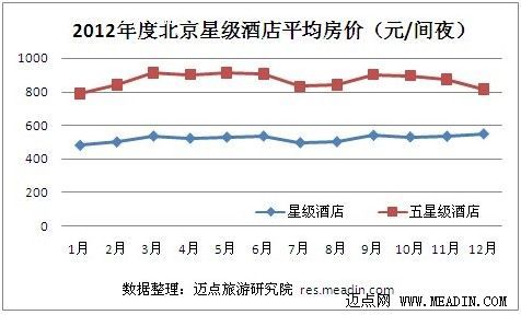 观察2012年度北京1-12月星级酒店的平均房价,各星级酒店平均房价和五星级酒店平均房价最低都在1月份,1月星级酒店的平均房价是483元/间夜,五星级酒店的平均房价是788.3元/间夜。星级酒店整体平均房价最高出现在12月,为548.9元/间夜,而五星级酒店房价最高则是出现在3月份,房价达到912.6元/间夜。