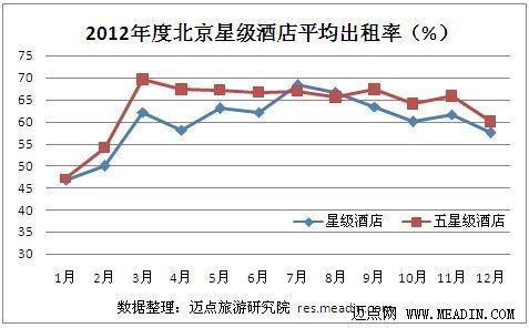 观察2012年度北京1-12月星级酒店的平均出租率,各星级酒店平均出租率和五星级酒店平均出租率最低都在1月份,1月星级酒店的平均出租率是46.8%,五星级酒店的平均出租率是47.3%。星级酒店整体平均出租率最高出现在7月,出租率为68.3%,而五星级酒店出租率最高出现在3月份,出租率达到69.5%。