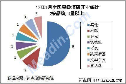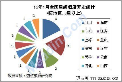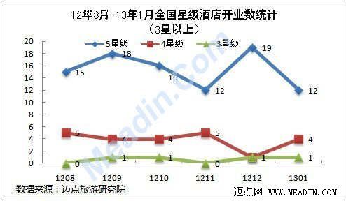 据迈点旅游研究院对国内酒店开业情况的不完全统计,2013年1月,国内开业的星级酒店数为17家,客房总数约4047间(套)。与上月相比,本月新开业星级酒店总数下降了5家,降幅为19%;客房总数与上月相比下降约1917间(套),降幅为32%。本月开业酒店中,五星级酒店有12家、四星级酒店4家、三星级酒店有1家。