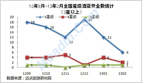2013年2月,国内开业的星级酒店数为9家,客房总数约1582间(套)。与上月相比,本月新开业星级酒店总数下降了8家,降幅为47%;客房总数与上月相比下降约2465间(套),降幅为61%。