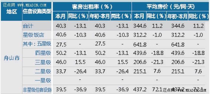 [舟山]13年1月星级饭店平均房价和出租率 迈点网 · Data · 2013-04-27 17:23:22 分享到 打开微信“扫一扫”,打开网页后点击屏幕右上角分享按钮。 根据浙江省统计局统计数据,13年1月,舟山市星级饭店平均房价为344.6元/间,同比上升11.2%。13年1月,舟山市星级饭店平均出租率40.3%,同比下降13.1%。 舟山星级饭店平均房价和出租率 0