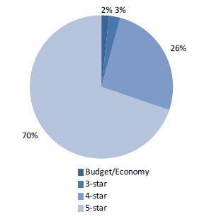 关于参与调查的酒店星级,70%的酒店为5星级酒店,26%的酒店为4星级酒店;此外,3星级酒店和经济型酒店分别占3%和2%。