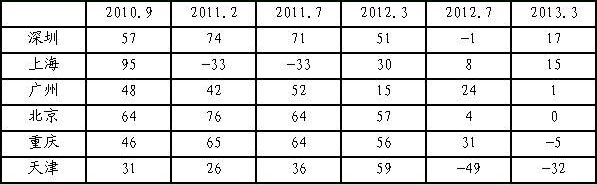 在中国主要城市中,得分最高的前4个城市为深圳(17)、苏州(17)、上海(15)、西安(13);得分最低的3个城市为天津(-32)、杭州(-17)、成都(-12)。