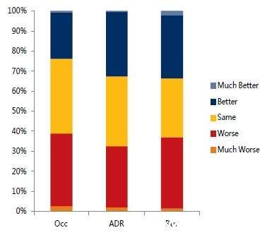 2013酒店营业总收入与其它两项指标相比前景更加看好;37%的受访者表示2013酒店营业总收入将更加恶化;34%的受访者表示酒店营业总收入将有所上升;只有29%的的受访者表示酒店营业总收入将与2012年持平。