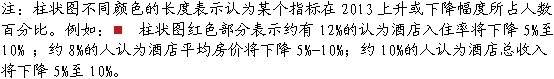 由于酒店入住率和酒店总收入与去年相比略有改观,中国整个酒店前景负面趋势有所缓和。而且,酒店经营者对于酒店平均房价持保守态度。总体而言,2013年酒店持续增长的不确定因素仍然存在。