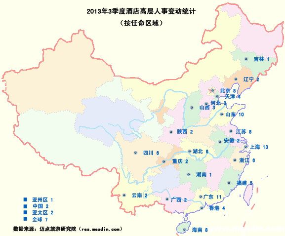 迈点旅游研究院统计数据显示,3季度国内酒店业的人事任命,全国有22个地区有酒店高层的人事任命。本季度任命人数最多的地区是上海,共任命了13位高管,占全部人事任命总数的11%;紧随其后是广东地区,任命了11位高管,占人事任命总数的9%;其次山东地区有8位高管任命,占比8%;其它地区海南、江苏和北京各任命了8位;浙江、湖北和四川各任命了6位;福建任命了5位;天津和香港各4位;河北和山西各3位;除了以上提到的,像辽宁、云南、重庆、广西、安徽、陕西等多地均有高管任命。值得关注的是3季度,还出现全球、亚太区、亚洲区、中国等多个区域的高管任命。