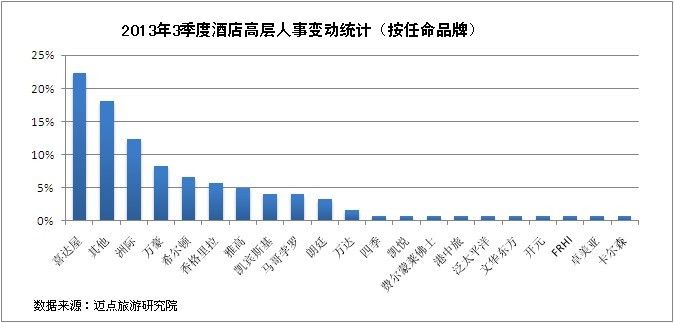 迈点旅游研究院统计数据显示,本季度喜达屋品牌表现最为活跃,共任命了27位高管,占星级酒店人事任命总数的22%;其次是洲际品牌,任命了15位高管,占总任命数的18%;万豪任命了10位,占比8%;除了以上提到的,本月以下品牌也均有任命,分别是希尔顿(8位)、香格里拉(7位)、雅高(6位)、凯宾斯基(5位)、马哥孛罗(5位)、朗廷(4位)、万达(2位)此外还有卓美亚、四季、费尔蒙莱佛士、凯悦、港中旅、泛太平洋、文华东方、开元等多个品牌。