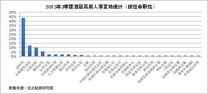 可以看到本季度任命的高层职位种类非常多,共28种,除此本季度任命的总经理数量较多,将近占到整个季度任命总数的一半,除传统的跳槽因素外,在这几个月,集团对旗下酒店总经理的调动也比较频繁,这主要体现在国际酒店上。