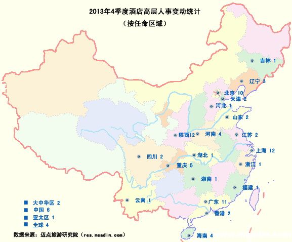 迈点旅游研究院统计数据显示,4季度国内酒店业的人事任命,全国有21个地区有酒店高层的人事任命。本季度任命人数最多的地区是上海和陕西,各任命了12位高管,各占全部人事任命总数的13%;紧随其后是广东地区,任命了11位高管,占人事任命总数的12%;其次北京地区有10位高管任命,占比11%;其它地区:重庆5位;海南和河南各任命了4位;辽宁3位;天津、江苏、山东、四川和香港各2位;除了以上提到的,像浙江、福建、吉林等多地均有高管任命。