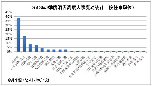 从人事任命的职位来看,本季度酒店高管任命数量最多的是总经理职位,根据迈点旅游研究院的统计,本季度共任命了35位总经理,占人事任命总数的38%;其次是任命了16位市场销售总监,占本季度星级酒店人事任命总数的18%;行政总厨职位共任命了8位,占比9%。此外还出现较多其它职位的任命,例如餐饮总监7位;首席执行官4位;人力资源总监、副总经理、房务总监、商务发展总监各任命了2位;此外,本季度还有资深开发副总裁、运营总监、行政副总等多种职位高管任命。其中集团任命的高管有13位。