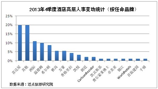 迈点旅游研究院统计数据显示,本季度喜达屋品牌表现最为活跃,共任命了18位高管,占星级酒店人事任命总数的20%;其次是洲际品牌,任命了10位高管,占总任命数的11%;温德姆任命了9位,占比10%;除了以上提到的,本月以下品牌也均有任命,分别是希尔顿(8位)、雅高(5位)、香格里拉(4位)、凯悦(3位)、朗廷(2位)、CarlsonRezidor(2位),此外还有凯宾斯基、卓美亚、锦江、千禧等多个品牌。