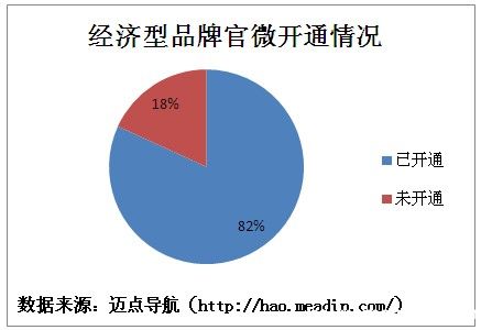 据迈点研究院数据显示,相对于最新崛起的中档酒店品牌,经济型品牌已有多年“江湖地位”,因此,在微博营销这一块,显然也是先人一步的。此前,中档酒店品牌中,有将近一半的品牌尚未有官微入驻;而在经济型酒店中,82%的经济型品牌都已拥有集团官微。