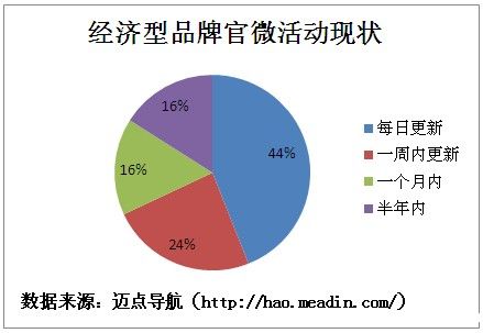 据迈点研究院数据显示,目前,经济型酒店品牌官微的活动状况并不如人意。坚持每日更新的仅占44%,而32%的集团似乎已经开始退出微博这个宣传、推广渠道。当中,16%的集团已有一个月没有动静,当中包括尚客优、城市客栈等;近半年没有任何消息发布的集团官微,也占到16%;这当中包括桔子酒店、99旅馆、金广快捷等。他们当中,有的是弃微博而转战微信,有的则是两者都不顾及。