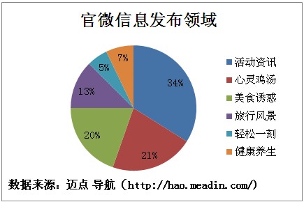 据迈点研究院数据显示,经济型酒店集团官微在内容发布上,与先前参与调查的国际集团官微、中档品牌官微等基本如出一辙,吃喝玩乐一应俱全。作为一个宣传推广平台,活动资讯在内容发布上依旧是稳居第一,占比34%;微博界备受亲睐的“心灵鸡汤”再一次荣登亚军地位,占比21%。为了避免硬广告令人生厌,美食、风景、搞笑、健康,均被官微所推崇,旨在软硬兼施地吸引用户眼球。