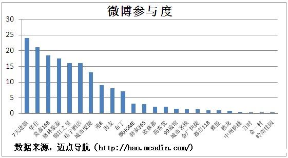 据迈点研究院数据统计显示,在经济型酒店集团官微中,粉丝的微博参与度呈现一个严重的两极分化趋势。单条微博平均参与度10以上的,不在少数。这是此前参与调查的国际集团、中档品牌等官微中尚未呈现的,但同时,又有一大批的酒店官微,微博参与度极其不乐观,这样的现象,令人堪忧。