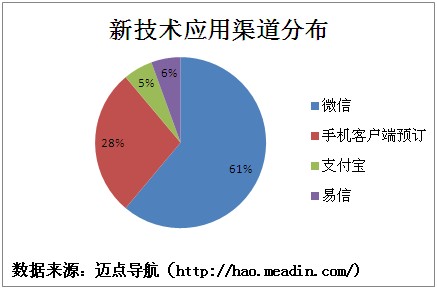在迈点研究院数据调查显示中,61%的酒店均有在微博中分享其微信号,邀众人关注。同时,28%的酒店拥有自己酒店的手机预订客户端,方便预订。当中包括锦江、华住、如家等。而对于新推出的支付宝、易信,部分酒店也相当的眼疾手快,瞄准市场,及早入驻。显然,这是很明智的选择。据报道,布丁酒店作为首家上线支付宝公众服务的酒店,至今也是收获颇丰,引发了酒店业预订的新战火。支付宝,也将成为未来酒店进军的新战场。
