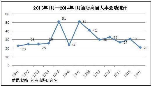 (迈点网 周凤)2014年1月,进入迈点网“中国酒店业行业监测系统平台”的5982家星级酒店企业中,总共有21位高管被任命,任命人数与去年同期相比,减少了2位。