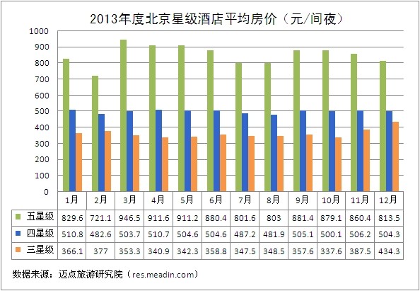 2013年度,北京地区星级酒店平均房价月度变化中,四星级酒店平均房价表现较为平稳,五星级酒店波动稍大,其中,在3到5月,北京五星级酒店的平均房价均超900,最高出现在3月,达946.5元/间夜,最低出现在2月,为721.1元/间夜。