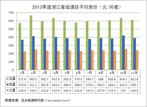 2013年1-11月,浙江地区星级酒店平均房价月度变化中,五星级酒店,平均房价最高出现在10月,为643.3元/间夜,房价最低的月份是1月,为571.6元/间夜。