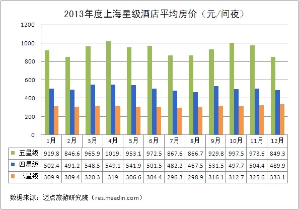2013年度,上海地区星级酒店平均房价月度变化中,五星级酒店,平均房价最高出现在4月,为1019.08元/间夜,也是在本年度中唯一房价超千元的月份。房价最低的月份是2月,为846.63元/间夜。