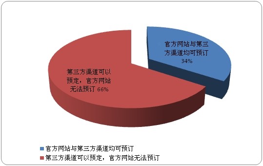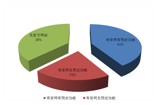 经过本次对全国358家酒店进行抽样,发现具备官方网站且有预定功能的酒店仅占调查总数的41%,其中38%的酒店无官方网站,21%的酒店有官方网站但无预定功能。针对此现象,在政府三公消费锐减的今天酒店更应对市场进行细分,多渠道开展销售工作,而官方网站则是酒店直销渠道不可或缺的重要组成部分。假如酒店针对官方网站建设,专业人才匮乏,无力进行,可以外包给第三方进行,来弥补由于官方网站缺失或官方网站无法进行预订而带来的经济损失。