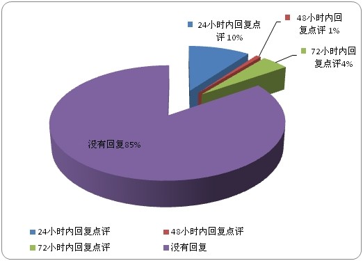 根据我们对国内的358家酒店进行数据统计和分析,确如艾瑞咨询数据统计显示,在统计对象中有85%的酒店针对点评是永不进行回复的。72小时回复的官方网站仅占4%,48小时回复的官方网站仅占1%,24小时回复的官方网站仅占10%。因此,针对此现状建议酒店安排专人对在线渠道进行管理,其中包括官方网站的库存管理、房态管理和点评管理。