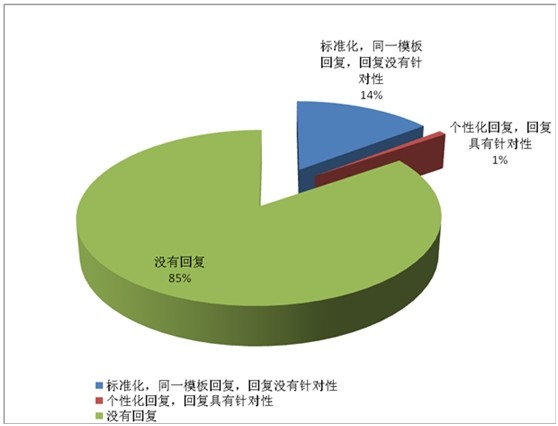 结合全国358家高星级酒店数据分析,可以看出在有官方网站且有点评功能的酒店中,85%的酒店不回复或永不回复客户的点评;14%的酒店则是千篇一律、应付了事的点评,回复没有任何针对性,是为了回复点评而进行点评;仅仅有1%的酒店对点评非常关注,更多的是有针对性的、个性化的点评。