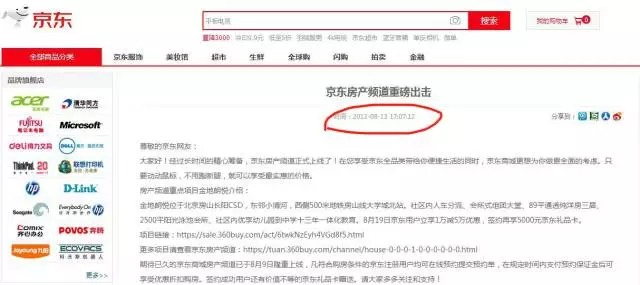 今年9月18日京东召开新房正式上线发布会,其实京东早在2012年就宣布要做房产频道了,估计那个时候还没有上市,主要品类还是在3C、图书之类,2014年双11时京东和远洋地产做了一个1.1折卖楼的噱头,之后两年沉寂,今年挖来了原搜狐焦点房产总经理曾伏虎才大张旗鼓进军房产电商交易平台。