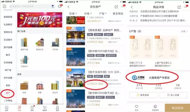 京东宣称做房产有三大王牌:一是“流量大”、活跃用户2.5亿人次;二是“交易方便”,除了微信支付还有京东白条等;三是“供应商多”,十几万商家和100多万客户等。