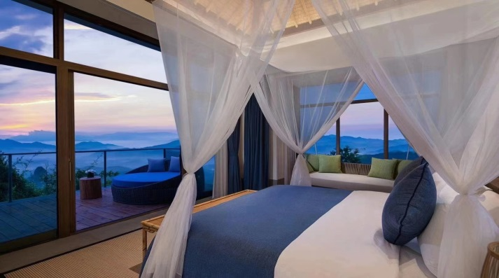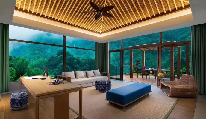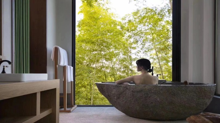御水温泉度假酒店总店的负责人,对什么是生活方式酒店,有独到的见解和认知:“我们平时在家里的是通常生活方式。而到了度假酒店之后,是全新的体验:不同的环境和氛围、不同的居家布局和装饰风格、不同的布草和家具、以及不同的食宿感受,这就是体验全新的、与平时在家不同的、度假酒店的生活方式”。竹溪谷53栋别墅中,50栋是别墅客房。而每栋别墅客房,其实都是自带野奢度假的产品。房内都是超大房型的陈设,完全区别于城市商务酒店程式化的空间布局;房内多处落地大玻璃窗,让人们的视野不受任何阻碍,可眺望大片竹海、远处的田野村落以及崇山峻岭、如带湖泊;宽大的阳台可依躺、可小坐,阳光下可品茗阅读;别墅内私家庭院中的无边泳池,可游泳休闲放空;别墅内硕大的石制温泉泡池,别具风格情调......其实,每栋别墅客房,已是野奢度假的极致产品了!喜欢幽静安宁、不想户外活动的客户,在别墅内即可奢华度假。难怪许多网评中赞叹:竹溪谷是“超五星的硬件和服务,新中式又带巴厘岛风情的房间”。