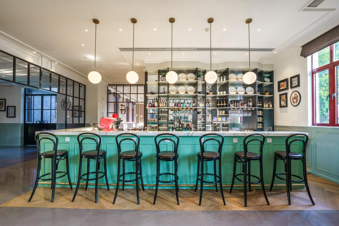 凯宾斯基酒店,在突出“明皇宫”的艺术设计的主框架下,并不排除多元设计风格的展露。古今交融、中西合璧的风范,在“王字楼”的设计中,得到充分表达。“王字楼”紧邻酒店主楼,是业主方金城集团老厂区遗存的、几栋“明皇宫”附属建筑中的一栋。最初为明故宫机场飞行员俱乐部。因俯视可见其屋顶结构似“王”字而命名。“王字楼”历经百年历史长河。现在它被命名为“金凯楼”。金凯楼中餐厅,将雅致的民国格调,与精巧的现代设计糅合一起,包间主题风格各异,整体空间色调稳重古朴,选用大理石、木饰面、及古铜色金属,搭配优雅简约的家私,点缀具有航空元素的艺术品,体现了“王字楼”飞行员俱乐部的主题风格。而楼内的弗里达德式餐厅,地面采用水磨王、原木色地板,搭配简约的藤编沙发座椅和暖色调灯光,打造轻松愉快的用餐环境氛围。