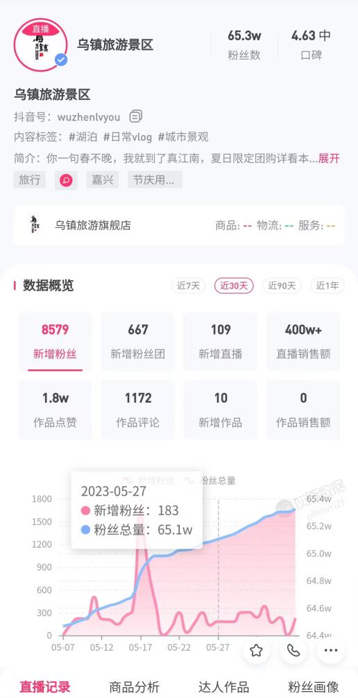 乌镇作为国内知名旅游景点,一直深受游客的喜爱,通过分析发现“乌镇旅游景区”官方抖音账号近30天销售额超过400万元,成为景区类抖音账号销售额榜首。从官方店铺来看产品主要为景区成人票及“酒+景”套餐产品。从账号质量来看,“乌镇旅游景区”账号粉丝量达65.3万,作品数量717个短视频,从直播规律来看,固定每天上、下、晚三场直播,从上午八点到晚八点。