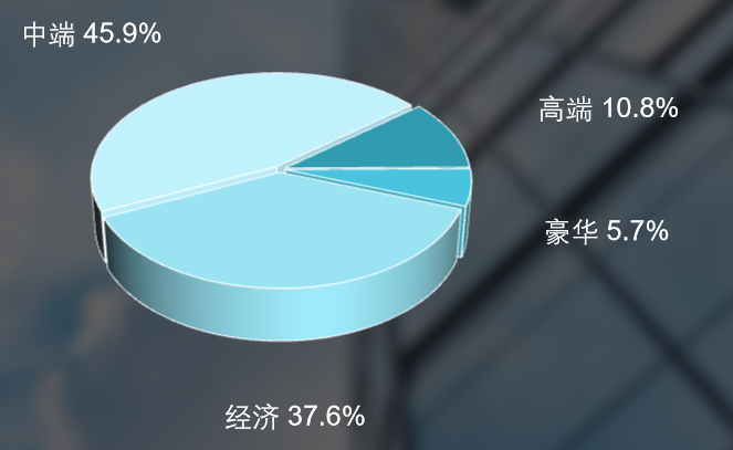 按档次划分,中端占45.9%,经济型占37.6%,高端占10.8%,豪华型占5.7%;